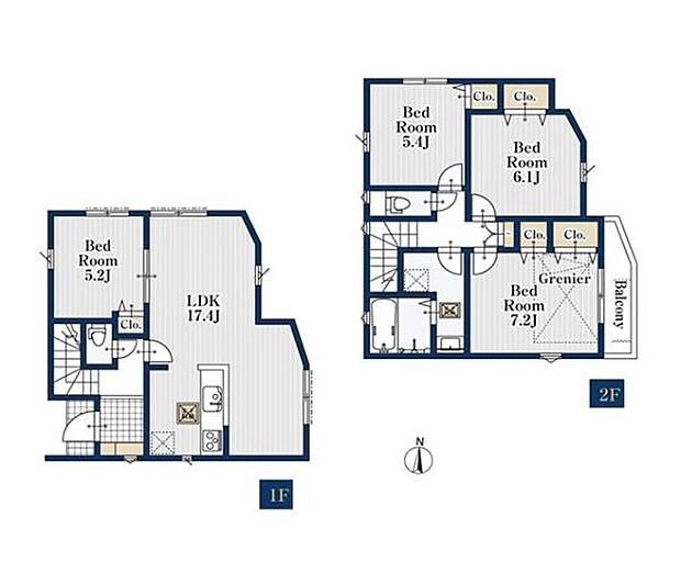 | 間取り | 4LDK 間取り内訳:リビングダイニングキッチン 17.4帖(1階)・洋室 5.2帖(1階)・洋室 5.4帖(2階)・洋室 6.1帖(2階)・洋室 7.2帖(2階) |