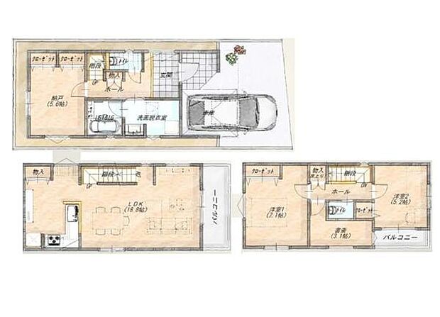 | 間取り | 2SLDK 間取り内訳:収納 5.6帖(1階)・リビングダイニングキッチン 18.8帖(2階)・洋室 7.1帖(3階)・洋室 5.2帖(3階) |