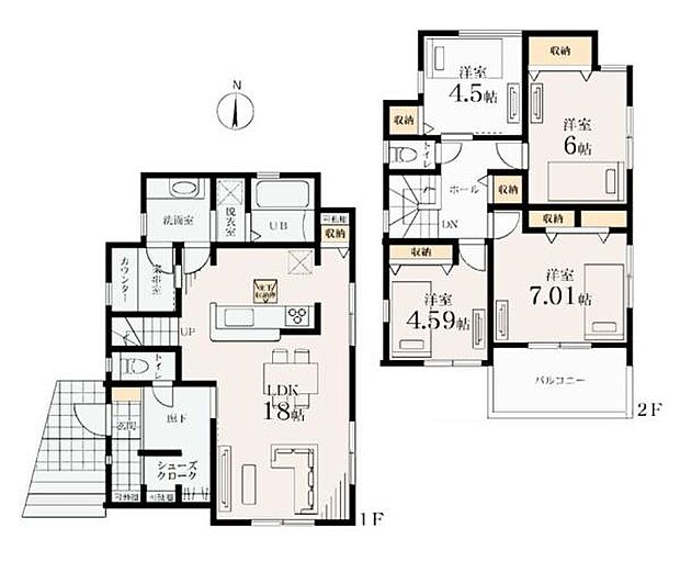 間取り内訳:洋室 6帖(2階)・洋室 7帖(2階)・洋室 4.5帖(2階)・リビングダイニングキッチン 18帖(1階)・洋室 4.5帖(2階)