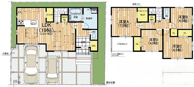 | 間取り | 4LDK 間取り内訳:リビングダイニングキッチン 19帖(1階)・洋室 7.5帖(2階)・洋室 4.5帖(2階)・洋室 4.5帖(2階)・洋室 6.5帖(2階) |