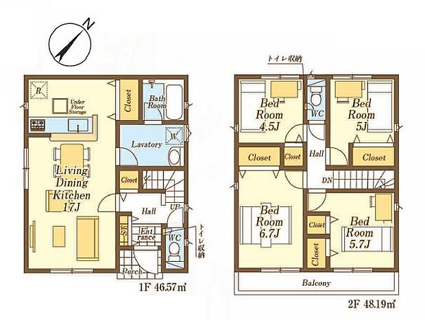 | 間取り | 4LDK 間取り内訳:洋室 6.7帖(2階)・洋室 5.7帖(2階)・洋室 5帖(2階)・洋室 4.5帖(2階)・リビングダイニングキッチン 17帖(1階) |