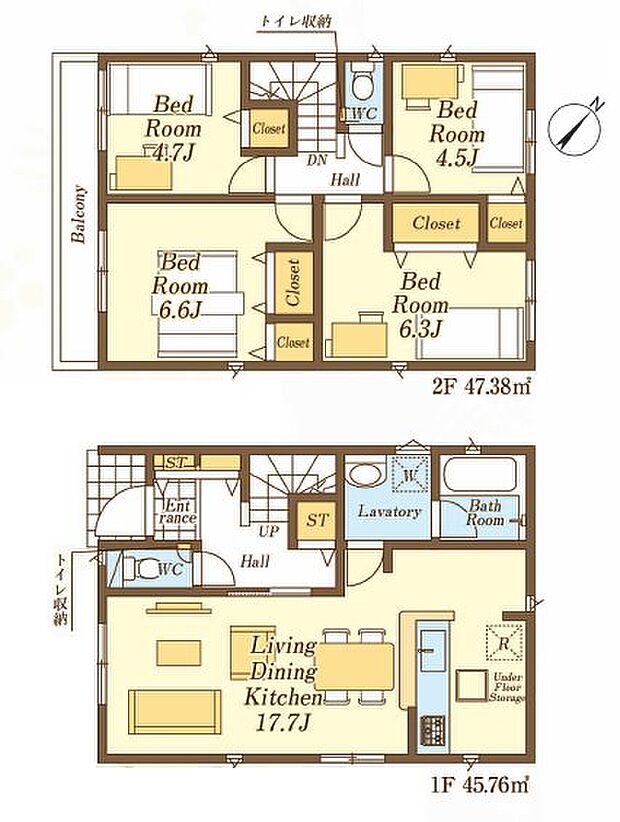 | 間取り | 4LDK 間取り内訳:洋室 6.6帖(2階)・洋室 6.3帖(2階)・洋室 4.7帖(2階)・洋室 4.5帖(2階)・リビングダイニングキッチン 17.7帖(1階) |