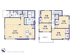 | 間取り | 1SLDK(パントリーあり) 間取り内訳:リビングダイニングキッチン 17帖(1階)・洋室 8.5帖(2階)・収納 6帖(2階)・収納 5.7帖(2階) |
