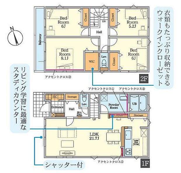 | 間取り | 4LDK 間取り内訳:リビングダイニングキッチン 21.7帖(1階)・洋室 6帖(2階)・洋室 8.1帖(2階)・洋室 6帖(2階)・洋室 5.2帖(2階) |