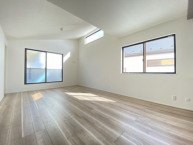 勾配天井の2階リビングは陽当たり良好 エコジョーズやカン太くん完備。お車2台駐車可能です。