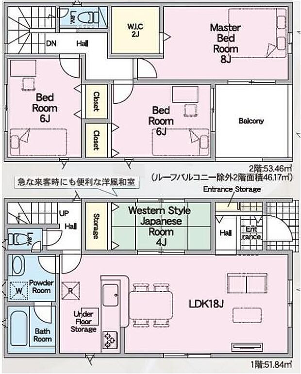 | 間取り | 4LDK 間取り内訳:リビングダイニングキッチン 18帖(1階)・和室 4畳(1階)・洋室 6帖(2階)・洋室 6帖(2階)・洋室 8帖(2階) |