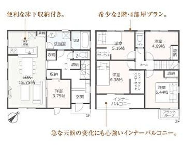 | 間取り | 5LDK 間取り内訳:リビングダイニングキッチン 15.7帖(1階)・洋室 3.7帖(1階)・洋室 4.6帖(2階)・洋室 6.4帖(2階)・洋室 6.3帖(2階)・洋室 5.1帖(2階) |