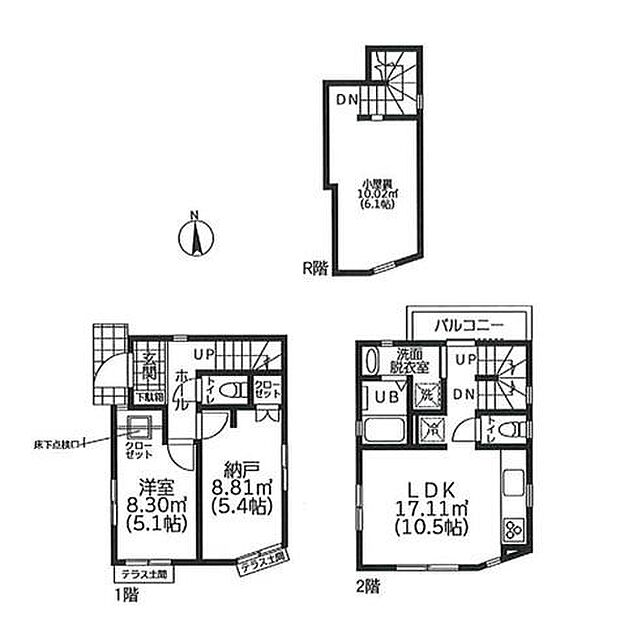 | 間取り | 1SLDK 間取り内訳:洋室 5.1帖(1階)・収納 5.4帖(1階)・リビングダイニングキッチン 10.5帖(2階) |