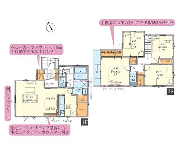 間取り内訳:リビングダイニングキッチン 18.7帖(1階)・洋室 5.2帖(2階)・洋室 8帖(2階)・洋室 6帖(2階)・洋室 5.2帖(2階)