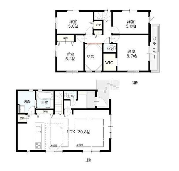 | 間取り | 4LDK 間取り内訳:リビングダイニングキッチン 20.8帖(1階)・洋室 5帖(2階)・洋室 5.2帖(2階)・洋室 8.7帖(2階)・洋室 5帖(2階) |