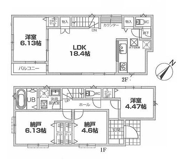 | 間取り | 2SLDK 間取り内訳:収納 4.6帖(1階)・洋室 4.4帖(1階)・リビングダイニングキッチン 18.4帖(2階)・洋室 6.1帖(2階)・収納 6.1帖(1階) |