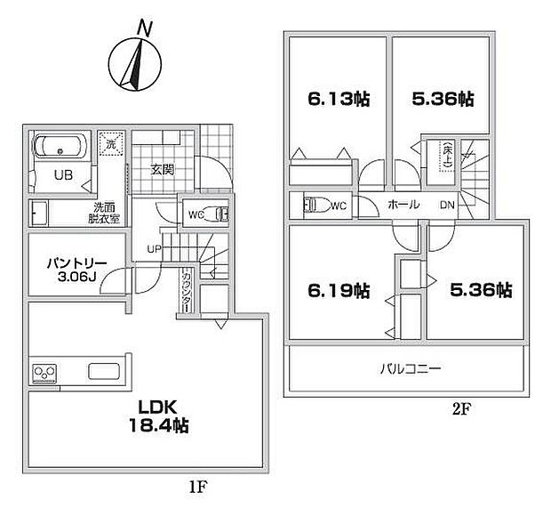 | 間取り | 4LDK 間取り内訳:リビングダイニングキッチン 18.4帖(1階)・洋室 6.1帖(2階)・洋室 6.1帖(2階)・洋室 5.3帖(2階)・洋室 5.3帖(2階) |