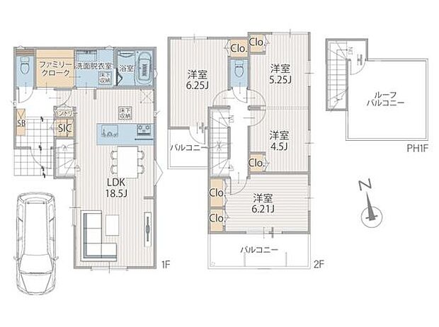 | 間取り | 3LDK 間取り内訳:リビングダイニングキッチン 18.5帖(1階)・洋室 6.2帖(2階)・洋室 9.7帖(2階)・洋室 6.2帖(2階) |