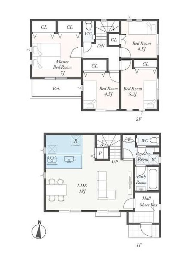 | 間取り | 4LDK 間取り内訳:リビングダイニングキッチン 18帖(1階)・洋室 7帖(2階)・洋室 4.5帖(2階)・洋室 5.3帖(2階)・洋室 4.5帖(2階) |