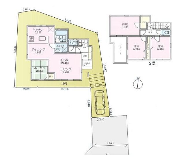 間取り内訳:リビングダイニングキッチン 19.4帖(1階)・洋室 6.9帖(2階)・洋室 5.2帖(2階)・洋室 5.4帖(2階)