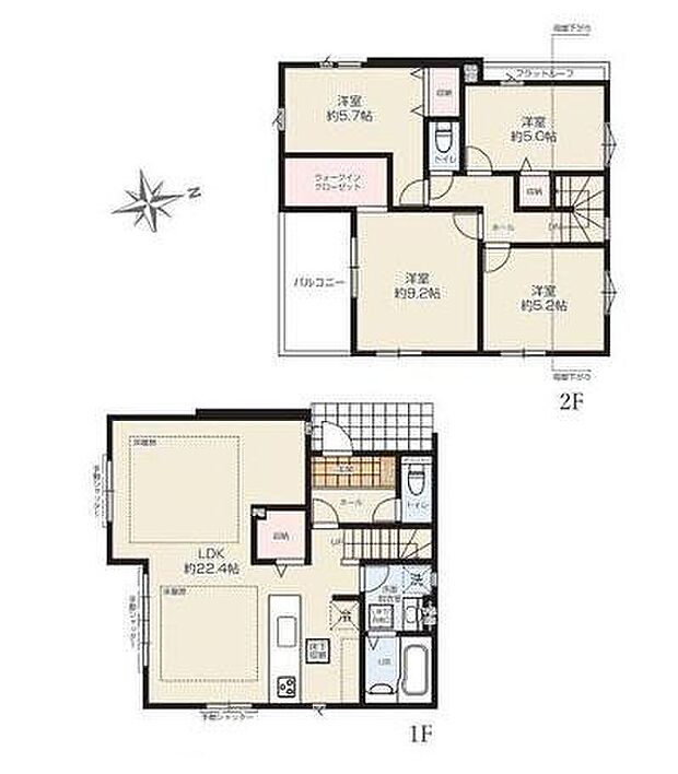 | 間取り | 4LDK 間取り内訳:リビングダイニングキッチン 22.4帖(1階)・洋室 5.7帖(2階)・洋室 9.2帖(2階)・洋室 5.2帖(2階)・洋室 5帖(2階) |