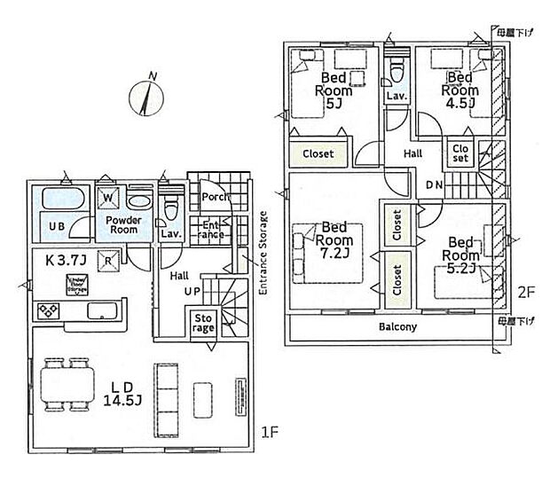 | 間取り | 4LDK 間取り内訳:リビングダイニングキッチン 18.2帖(1階)・洋室 5帖(2階)・洋室 7.2帖(2階)・洋室 5.2帖(2階)・洋室 4.5帖(2階) |