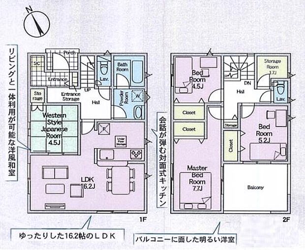 | 間取り | 4LDK 間取り内訳:リビングダイニングキッチン 16.2帖(1階)・和室 4.5畳(1階)・洋室 4.5帖(2階)・洋室 5.2帖(2階)・洋室 7.7帖(2階) |