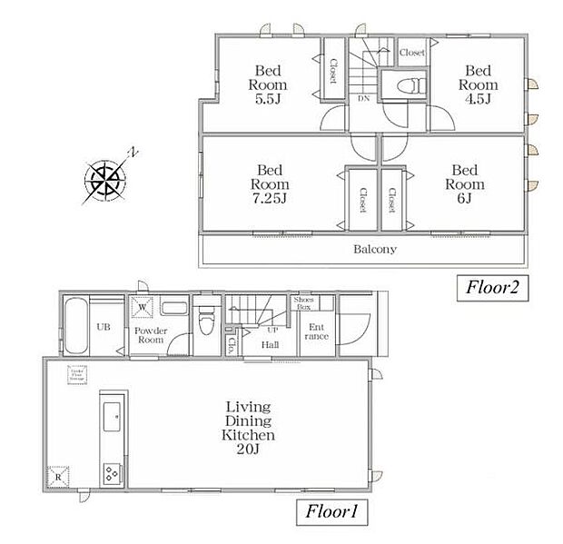 | 間取り | 4LDK 間取り内訳:リビングダイニングキッチン 20帖(1階)・洋室 5.5帖(2階)・洋室 7.2帖(2階)・洋室 6帖(2階)・洋室 4.5帖(2階) |