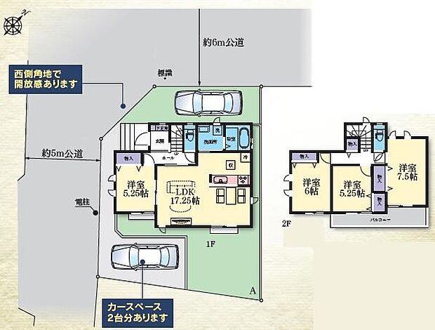 | 間取り | 4LDK 間取り内訳:リビングダイニングキッチン 17.2帖(1階)・洋室 5.2帖(1階)・洋室 6帖(2階)・洋室 5.2帖(2階)・洋室 7.5帖(2階) |