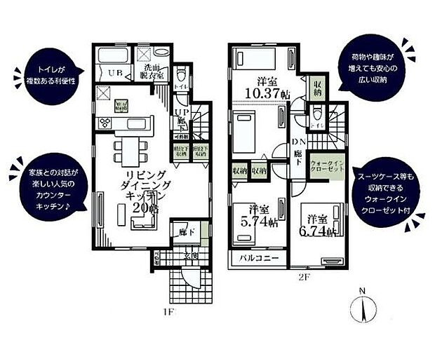 | 間取り | 3LDK 間取り内訳:リビングダイニングキッチン 20帖(1階)・洋室 10.3帖(2階)・洋室 5.7帖(2階)・洋室 6.7帖(2階) |