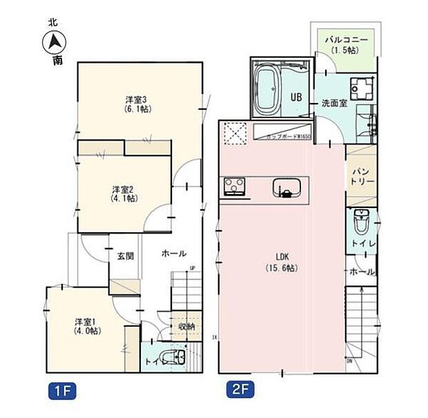 | 間取り | 3LDK 間取り内訳:洋室 6.1帖(1階)・洋室 4.1帖(1階)・洋室 4帖(1階)・リビングダイニングキッチン 15.6帖(2階) |