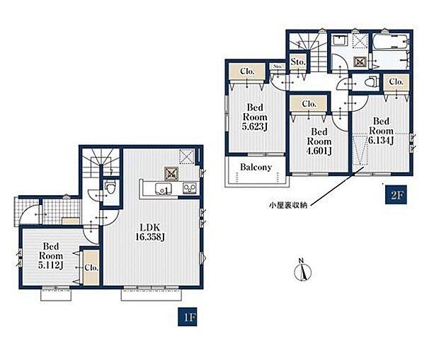 | 間取り | 4LDK 間取り内訳:リビングダイニングキッチン 16.3帖(1階)・洋室 5.1帖(1階)・洋室 5.6帖(2階)・洋室 4.6帖(2階)・洋室 6.1帖(2階) |
