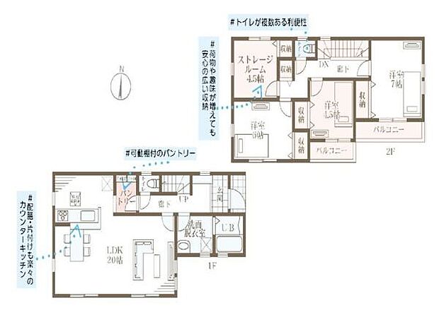 | 間取り | 3SLDK 間取り内訳:リビングダイニングキッチン 20帖(1階)・収納 4.5帖(2階)・洋室 6帖(2階)・洋室 4.5帖(2階)・洋室 7帖(2階) |