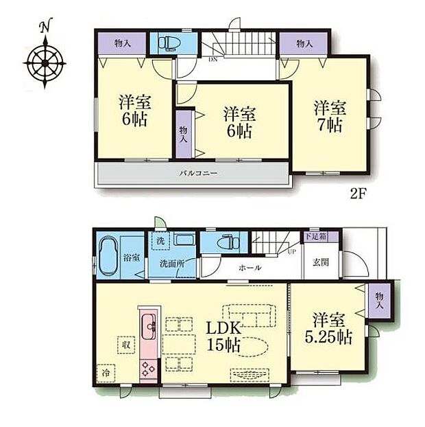 | 間取り | 4LDK 間取り内訳:リビングダイニングキッチン 15帖(1階)・洋室 5.2帖(1階)・洋室 6帖(2階)・洋室 6帖(2階)・洋室 7帖(2階) |