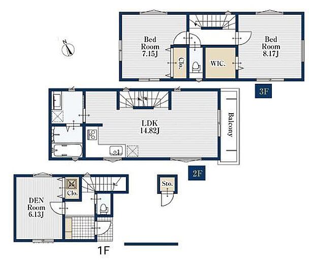 間取り内訳:収納 6.1帖(1階)・リビングダイニングキッチン 14.8帖(2階)・洋室 7.1帖(3階)・洋室 8.1帖(3階)