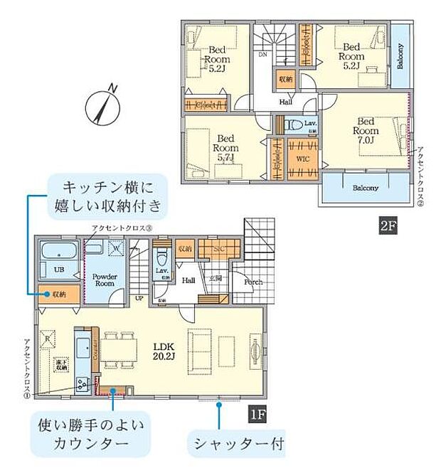 | 間取り | 4LDK 間取り内訳:リビングダイニングキッチン 20.2帖(1階)・洋室 5.2帖(2階)・洋室 5.2帖(2階)・洋室 7帖(2階)・洋室 5.7帖(2階) |