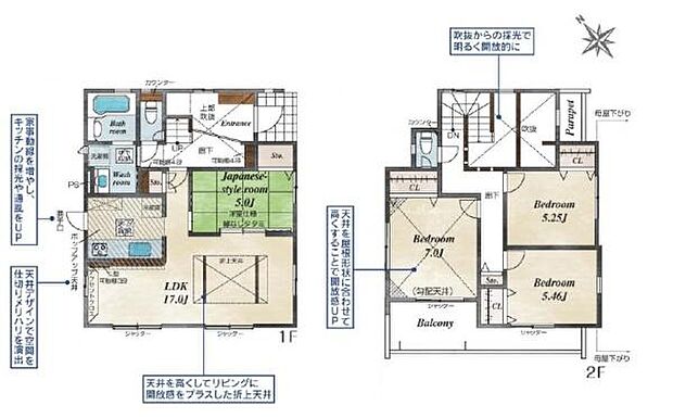 | 間取り | 4LDK 間取り内訳:洋室 5.4帖(2階)・洋室 5.2帖(2階)・リビングダイニングキッチン 17帖(1階)・和室 5畳(1階)・洋室 7帖(2階) |