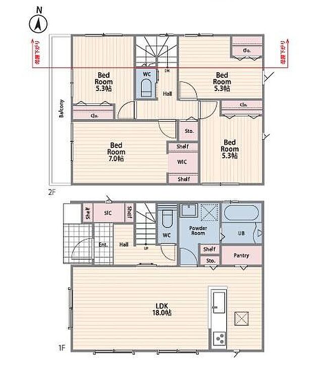 | 間取り | 4LDK 間取り内訳:洋室 5.3帖(2階)・洋室 7帖(2階)・洋室 5.3帖(2階)・洋室 5.3帖(2階)・リビングダイニングキッチン 18帖(1階) |