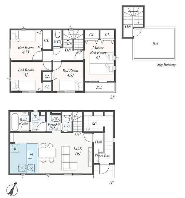 | 間取り | 4LDK 間取り内訳:リビングダイニングキッチン 16帖(1階)・洋室 4.5帖(2階)・洋室 5帖(2階)・洋室 4.5帖(2階)・洋室 6帖(2階) |