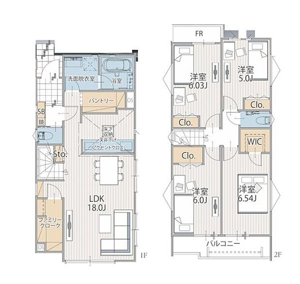 | 間取り | 4LDK 間取り内訳:リビングダイニングキッチン 18帖(1階)・洋室 6帖(2階)・洋室 5帖(2階)・洋室 6.5帖(2階)・洋室 6帖(2階) |