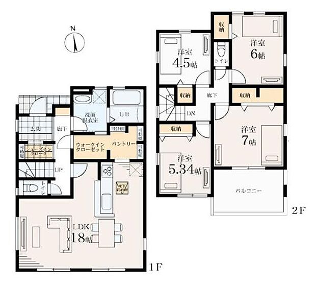 | 間取り | 4LDK 間取り内訳:リビングダイニングキッチン 18帖(1階)・洋室 4.5帖(2階)・洋室 6帖(2階)・洋室 7帖(2階)・洋室 5.3帖(2階) |
