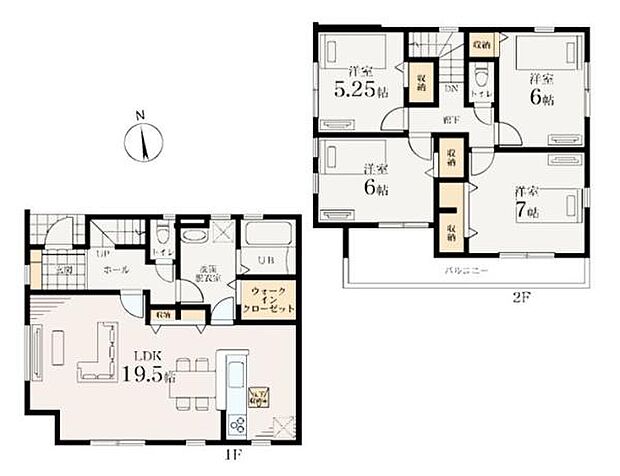 | 間取り | 4LDK 間取り内訳:リビングダイニングキッチン 19.5帖(1階)・洋室 5.2帖(2階)・洋室 6帖(2階)・洋室 7帖(2階)・洋室 6帖(2階) |