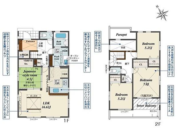 | 間取り | 4LDK 間取り内訳:リビングダイニングキッチン 16.6帖(1階)・和室 4.5畳(1階)・洋室 5.2帖(2階)・洋室 7帖(2階)・洋室 5.2帖(2階) |