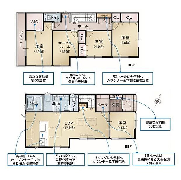 | 間取り | 4SLDK 間取り内訳:リビングダイニングキッチン 17.5帖(1階)・洋室 4.5帖(1階)・洋室 6.5帖(2階)・収納 5.5帖(2階)・洋室 4.5帖(2階)・洋室 6帖(2階) |