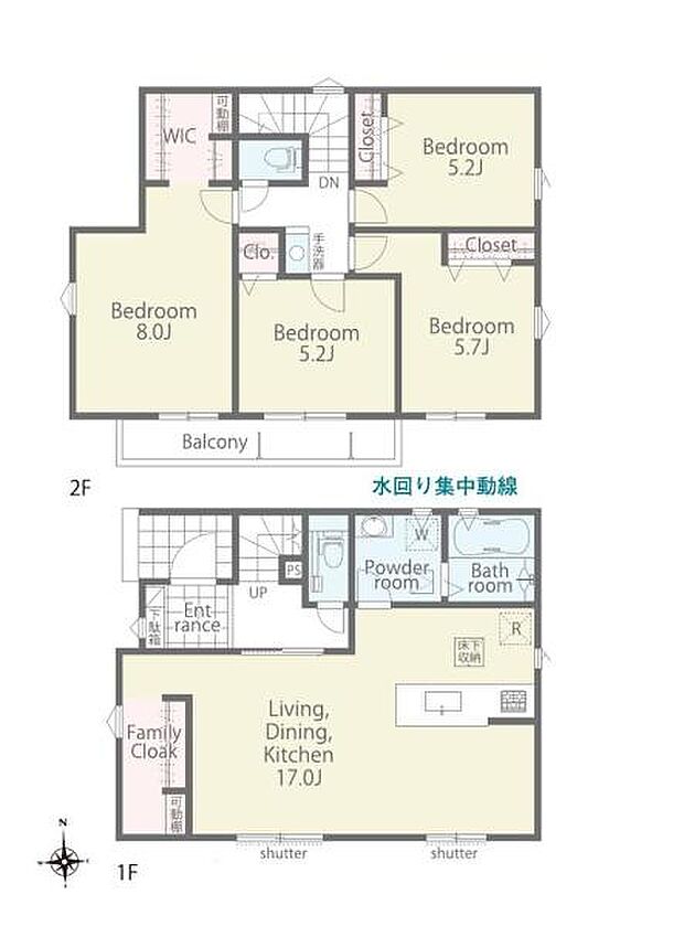 | 間取り | 4LDK 間取り内訳:リビングダイニングキッチン 17帖(1階)・洋室 8帖(2階)・洋室 5.2帖(2階)・洋室 5.7帖(2階)・洋室 5.2帖(2階) |