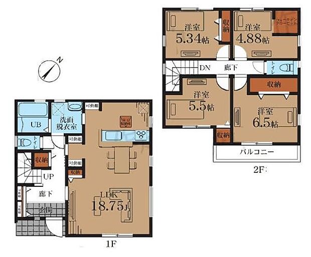 間取り内訳:リビングダイニングキッチン 18.7帖(1階)・洋室 5.3帖(2階)・洋室 5.5帖(2階)・洋室 6.5帖(2階)・洋室 4.8帖(2階)