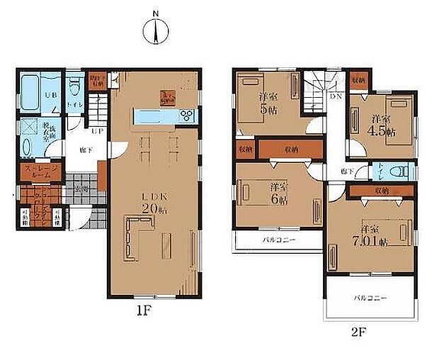 | 間取り | 4LDK 間取り内訳:洋室 4.5帖(2階)・リビングダイニングキッチン 20帖(1階)・洋室 5帖(2階)・洋室 6帖(2階)・洋室 7帖(2階) |