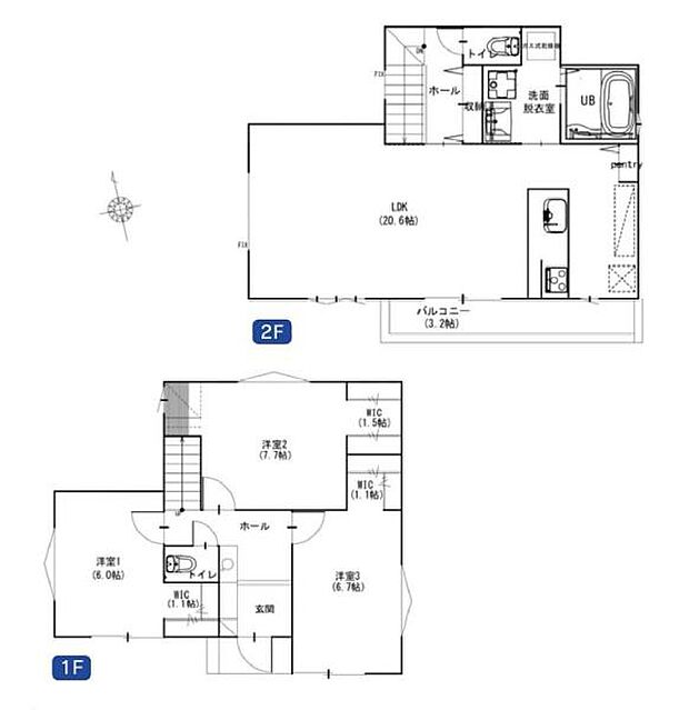 | 間取り | 3LDK 間取り内訳:洋室 7.7帖(1階)・洋室 6.7帖(1階)・洋室 6帖(1階)・リビングダイニングキッチン 20.6帖(2階) |