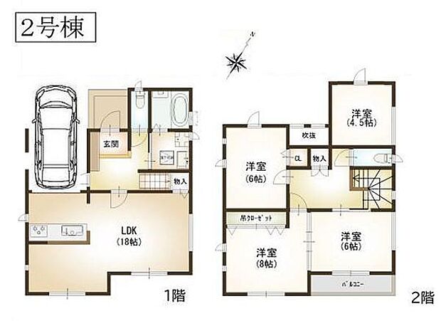 | 間取り | 4LDK 間取り内訳:リビングダイニングキッチン 18帖(1階)・洋室 8帖(2階)・洋室 6帖(2階)・洋室 6帖(2階)・洋室 4.5帖(2階) |