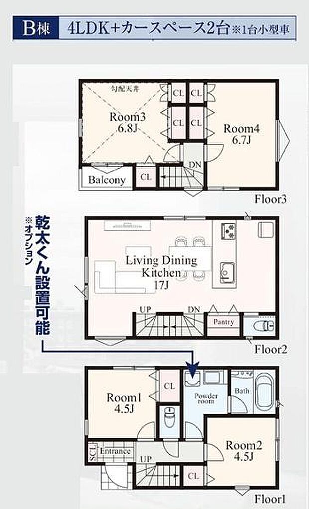 | 間取り | 4LDK 間取り内訳:洋室 4.5帖(1階)・洋室 4.5帖(1階)・リビングダイニングキッチン 17帖(2階)・洋室 6.8帖(3階)・洋室 6.7帖(3階) |