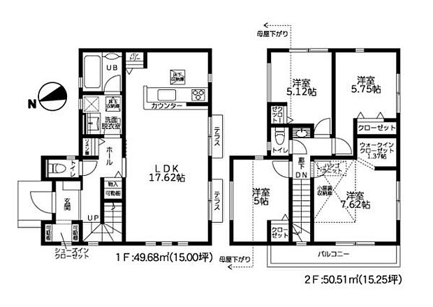 | 間取り | 4LDK 間取り内訳:洋室 5.1帖(2階)・洋室 5帖(2階)・リビングダイニングキッチン 17.6帖(1階)・洋室 7.6帖(2階)・洋室 5.7帖(2階) |