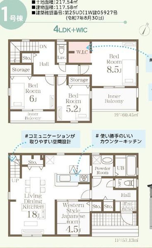 | 間取り | 4LDK 間取り内訳:和室 4.5畳(1階)・洋室 8.5帖(2階)・洋室 6帖(2階)・洋室 5.2帖(2階)・リビングダイニングキッチン 18帖(1階) |