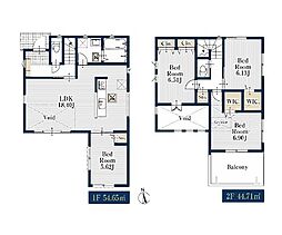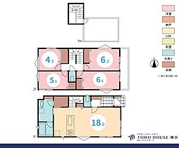 間取り内訳:リビングダイニングキッチン 18帖(1階)・洋室 6.6帖(2階)・洋室 6.3帖(2階)・洋室 5帖(2階)・洋室 4.5帖(2階)
