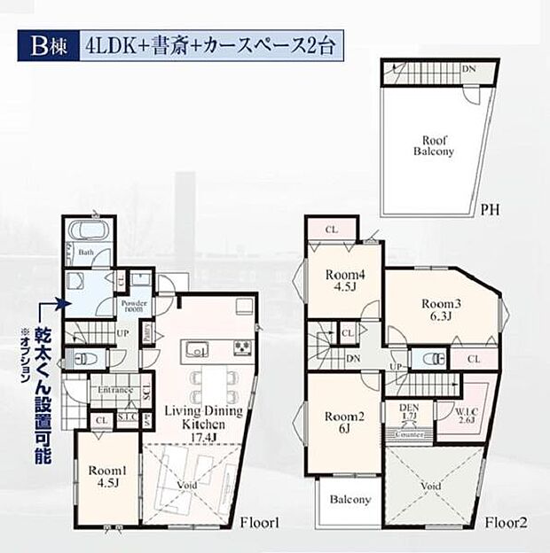 | 間取り | 4LDK 間取り内訳:リビングダイニングキッチン 17.4帖(1階)・洋室 4.5帖(1階)・洋室 6.3帖(2階)・洋室 6帖(2階)・洋室 4.5帖(2階) |