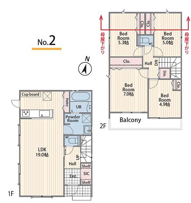 | 間取り | 4LDK 間取り内訳:リビングダイニングキッチン 19帖(1階)・洋室 7帖(2階)・洋室 5.3帖(2階)・洋室 5帖(2階)・洋室 4.9帖(2階) |